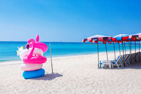 Fantasy Swim Ring and inflatable flamingo balloon on the sandy beach with blue sky and sea
