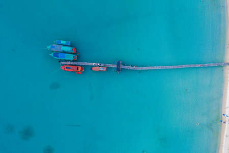 High angle shots of different ships It is docked at a Floating Piers on the beach on an island in southern Thailand.