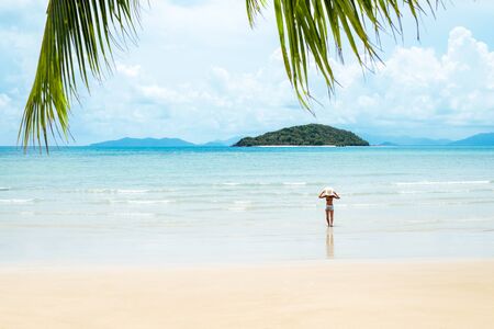 Green palm tree leaf and young woman standing on sand near sea