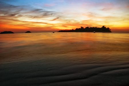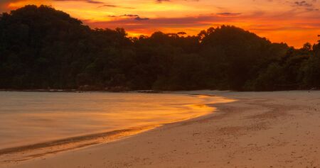 Teluk Nipah coral beach on Pangkor island in Malaysia. Beautiful landscape with sea taken during golden sunset in south east Asia.