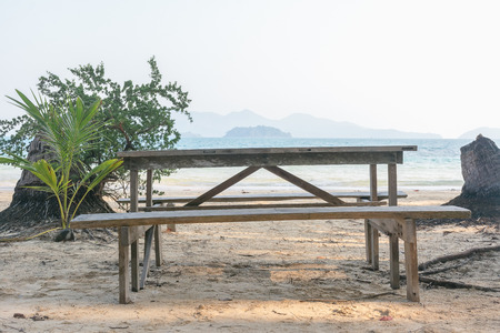 Wooden table and chair on sand at koh wai island, trat, thailand.