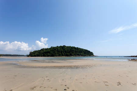 Tropical sandy beach with small island blue ocean and blue sky background image for nature background or summer design background copy space