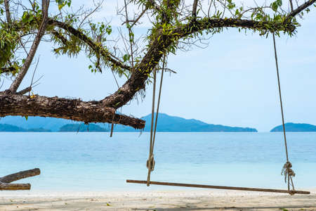 Old swing hanging on a tree on sandy beach, blue sea and sky background.