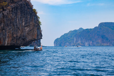 Long-tail boat, speedboat, rocks and sea, Phi Phi island, Thailand