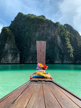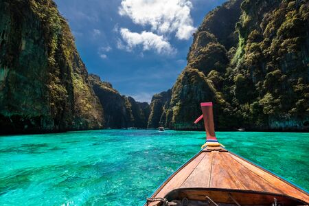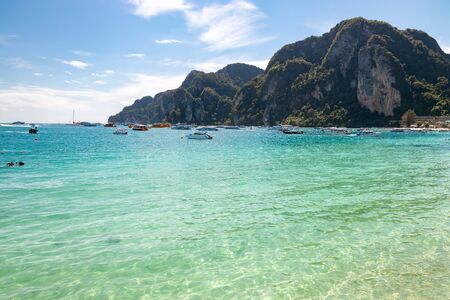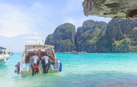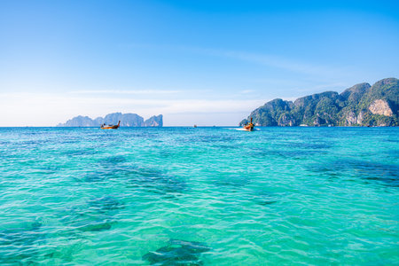 Tropical islands view with long tail boat and ocean blue sea water at Phi Phi Islands, Krabi Thailand nature landscape