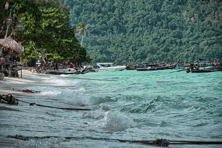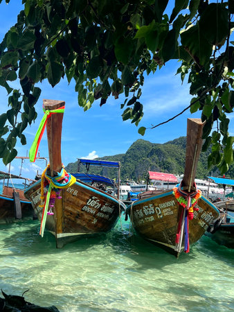 Phi Phi Island, Thailand - November 26 2019: traditional wooden longtail boats parked at a beach in Phi Phi Island. Clear water and clean beach.