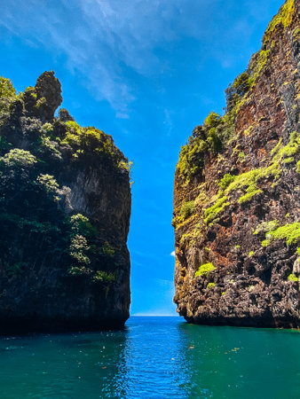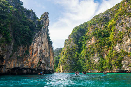 A picturesque beautiful place on the island of Phi Phi Leh - Pi Leh Lagoon is popular for excursions with tourists on traditional Thai fishing boats. island travel in thailand.
