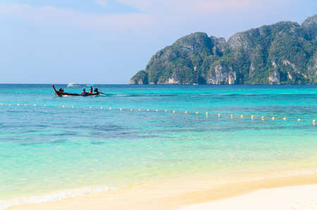 View of thai traditional longtail Boat over clear sea and sky in the sunny day, Phi phi Islands, Thailand