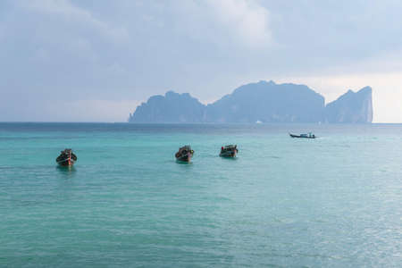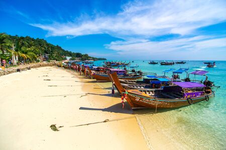 Traditional Thai wooden boats near sunny Thai beach on the Phi Phi island