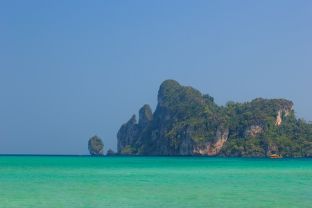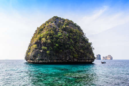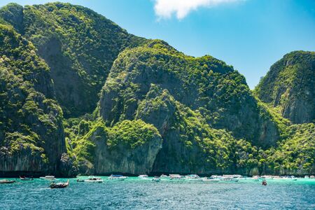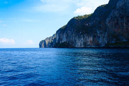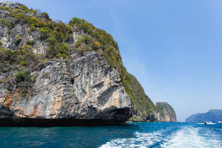 Cliff and the clear sea with a boat near Phi Phi island in south of Thailand