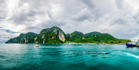 Panoramic view of lush green picture perfect tropical island, Phi-Phi Don, Thailand.