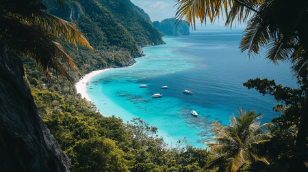Breathtaking aerial view of a tropical paradise featuring crystal clear lagoons, lush vegetation, and boats navigating the turquoise waters