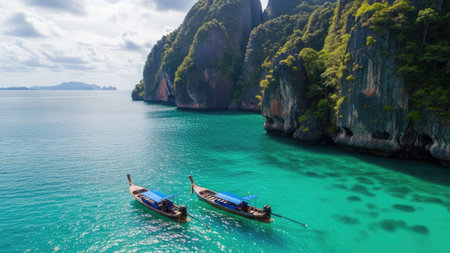 Generative AI : Aerial view of boats moored in the bay of Koh Rok Yai Beach island in Thailand