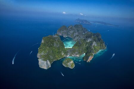 Aerial view of Phi-Phi Leh island with Maya Bay and Pileh Lagoon. Krabi province, Thailand. Top view of isolated rocky tropical island with turquoise water and white beach.