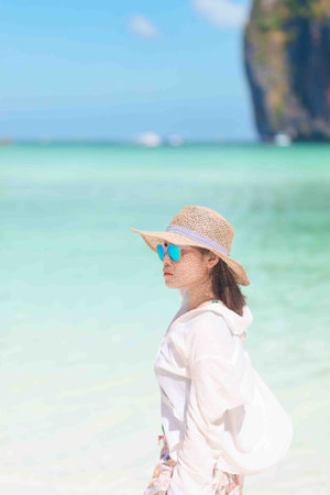 Woman tourist traveling and sightseeing in Krabi, Thailand, happy traveller enjoy at Maya Bay beach on Phi Phi island, Popular paradise island, destination, Southeast Asia Travel, vacation and holiday