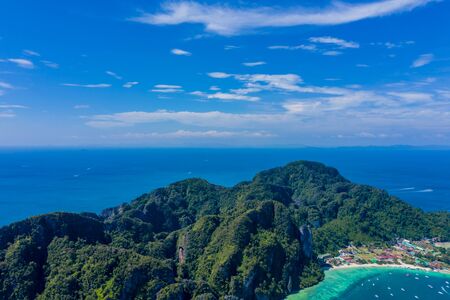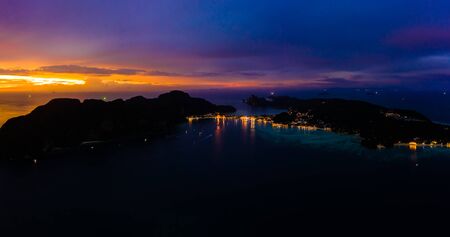 Aerial view of Phi Phi, Maya beach with blue turquoise seawater, mountain hills, and tropical green forest trees at sunset with Andaman sea in Phuket island in summer, Thailand in travel trip. Nature. Panorama