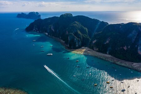 Blue clear water with boats. Green tropical island Phi Phi, palm trees grow. Shooting from a drone from the air. Beautiful seascape. Turquoise color of the water, you can see the bottom and corals.