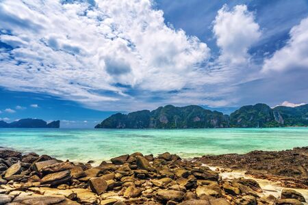 Beach in Krabi province. Vie of Maya Bay, Phi Phi island. Hong islands lagoon. Gray green stone rock on the background of crystal clear water in the sea.