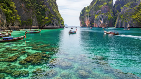 KOH PHI PHI, THAILAND - JULY 23: Motor boats on turquoise water of Maya Bay lagoon on July 23, 2016 in Koh Phi Phi island, Thailand.