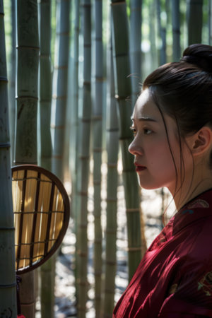 Blurred image woman wearing a red kimono stands in a bamboo forest, holding a traditional fan and looking to the side. AI generation