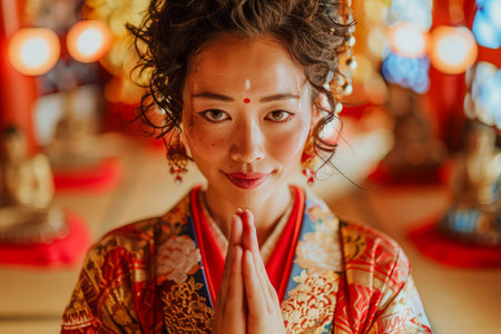 Beautiful Asian Woman in Traditional Red Kimono with Gold Embellishments, Greeting with Namaste Gesture in a Lantern Lit Room AI Generative