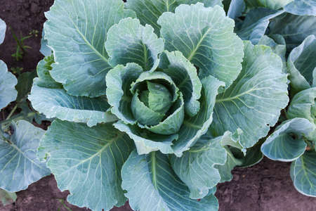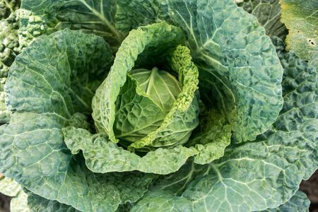 Top view on organic Cabbage. Fresh Green Head of Cabbage in the garden. Healthy eating.
