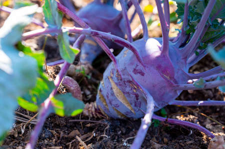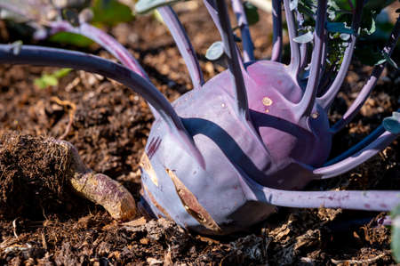 Organic purple kohlrabi cabbage growing in garden ready to harvest close up