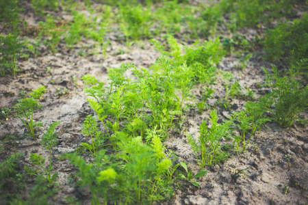 Young carrots in sandy soil. Home gardening concept.