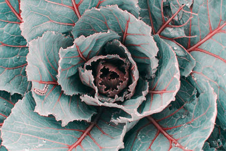 Cabbage in blue and turquoise trendy tones with red veins close up. Caterpillar crawls of leaf of cabbage with copy space. Insect in macro.