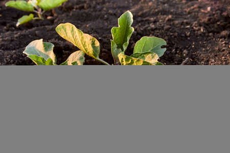 Green eggplant sprout. Young eggplant seedlings on the vegetable bed. Growing eggplant in the black soil in the garden. The theme of gardening, farming, a rich harvest, organic products. Horizontal photo.