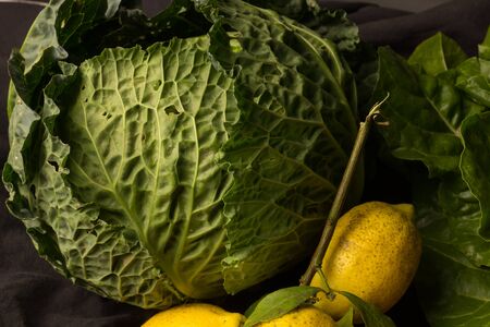 Raw and fresh cabbage and lemons, freshly picked from the garden, green and yellow and rich in vitamins; from the garden to the kitchen to make healthy and healthy dishes.