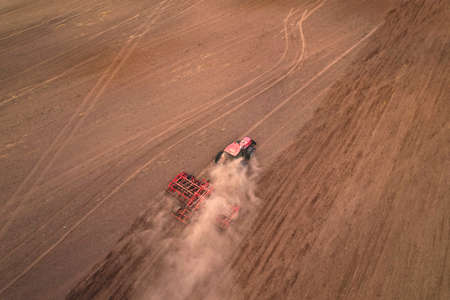 Field cultivation, aerial view. Tractor with disk harrow on plowed. Arable land plowed and soil Tillage. Agricultural Tractor with plowing on field cultivating. Red tractor on sowing seeds.