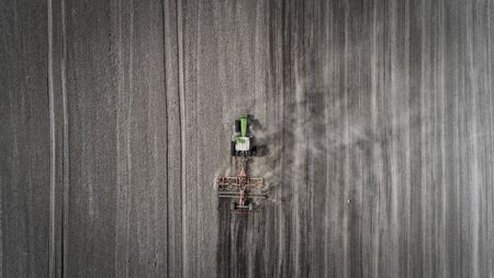 Aerial view of a clean field in which the tractor makes vertical tillage. Red tillage equipment and a green tractor on a dark gray background of the earth with drawings from the wheels. Top view with vertical stripes on the ground