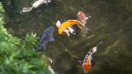 Koi fish swimming in a pond, close-up. High quality photo