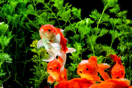 Goldfish in aquarium with green plants