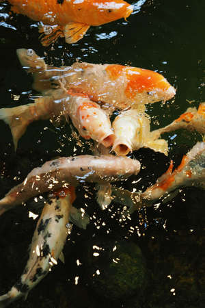 Koi or Japanese carp coming up to the surface in a rush for food