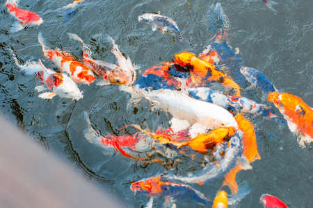 Pond with multiple numbers of Koi carp Carp fishes also know as Kohaku, Sanke, and Showa in it.