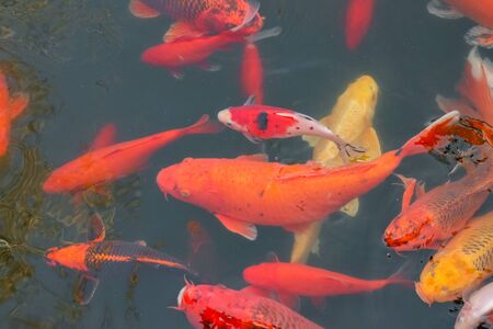 carp Chinese koi colorful fish swim in the water top view of the entire frame . High quality photo