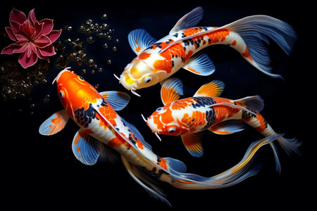 Beautiful Koi fish swimming in a black pond, Colorful Fancy carps on black background