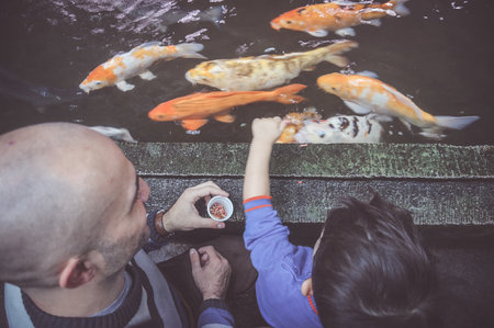 A man and child feeding fish in the Palmiarnia in Poznan, Poland