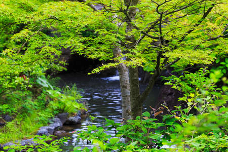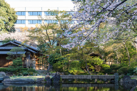Idyllic landscape of Japanese garden at summer day. Nagoya is a manufacturing and shipping hub in central Honshu.
