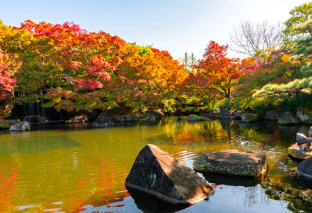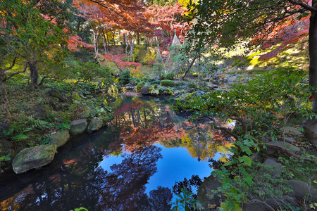 Koko-en autumn Garden with foliage color reflection on pond, Hyogo Prefecture, Himeji, Japan