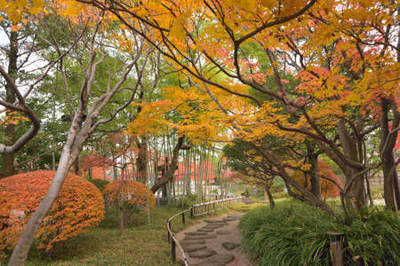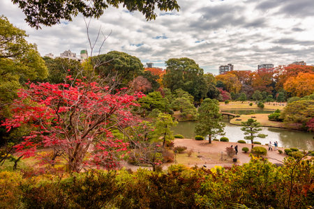 Tourists and Japanese people visit the famous and beautiful Rikugien Park during autumn season