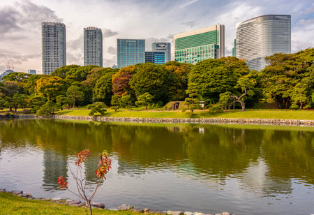Hamarikyu gardens with Shiodome skyscrapers at background in autumn, Tokyo, Japan