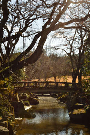 A sunny winter day, There is a bridge over a stream in the park with no people