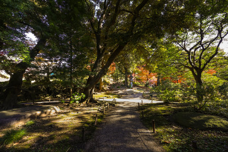 Tokyo, Japan, November 1, 2023: Tranquil pathway in a traditional Japanese garden