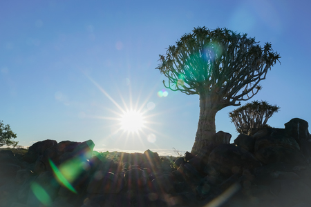 Sunburst late in afternoon through trees in Namibia Quiver tree forest landscape at Keetmanshoop