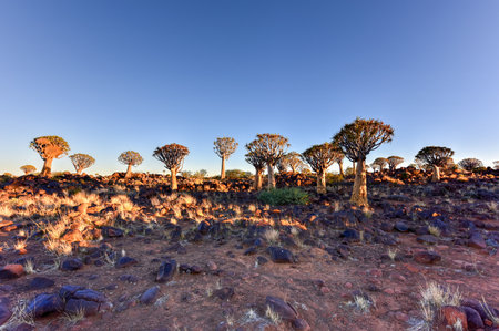 Landscape of quiver tree forest near Keetmanshoop in Namibia at sunset