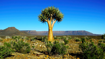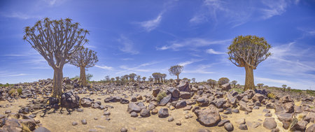 Panoramic picture of a quiver tree in the quiver tree forest near Keetmanshoop in southern Namibia during the day