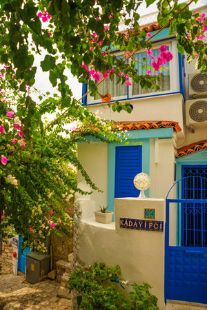 MARMARIS, MUGLA, TURKEY: Beautiful Streets of old Marmaris. Narrow streets with stairs among the houses with white brick, green plants and flowers in the old town of resort of in Turkey